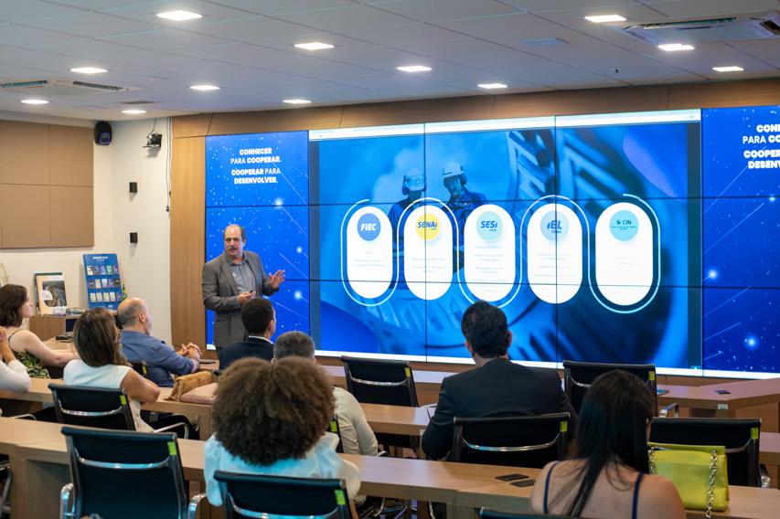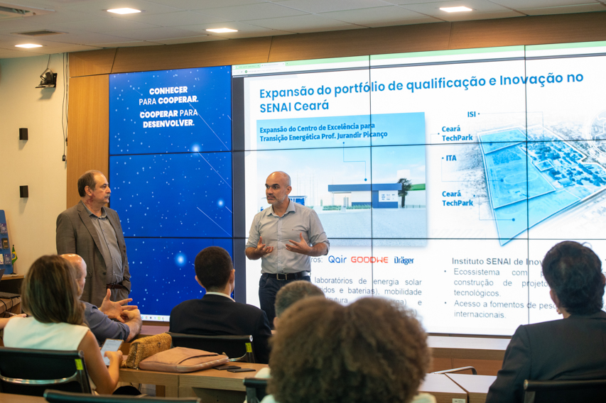 No Observatório da Indústria, a comitiva foi recebida pelo Economista-Chefe e Gerente, Guilherme Muchale. A apresentação de toda a infraestrutura do SESI e do SENAI Ceará foi feita por Paulo André Holanda, acompanhado pelo Diretor de Operações do Parque Tecnológico do Ceará, Rodrigo Pastl. E a apresentação do portfólio do Observatório foi feita por Muchale.
