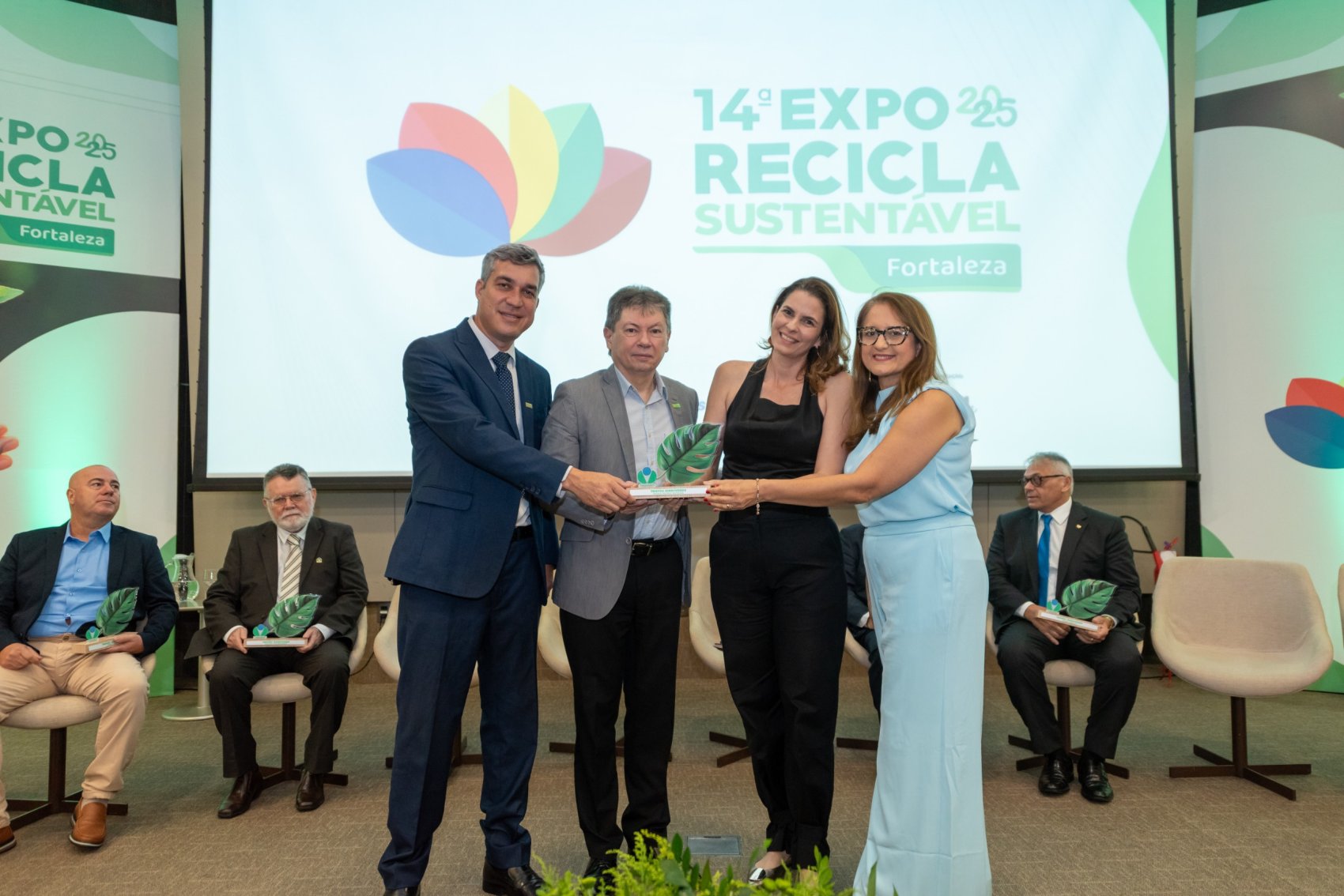 A programação seguiu com homenagens a lideranças que contribuíram de forma expressiva para a agenda ambiental em 2025. O Troféu Sindiverde Sustentável reconheceu o vice-presidente do sindicato, Marcos Albuquerque, cuja trajetória vem consolidando avanços na formalização das empresas de reciclagem e na difusão de práticas responsáveis. Também foram homenageados Elano Damasceno, presidente da Associação das Gestões Ambientais Locais do Ceará (Agáce); o professor Jackes Araújo, especialista em Direito Corporativo e Sustentabilidade; Paulo Pradas, gestor da Ambiental Fênix Reciclagem; e Maria Helena Botelho, dirigente da Mundo Limpo Reciclados, reconhecida pela ampliação da economia circular em diferentes setores.